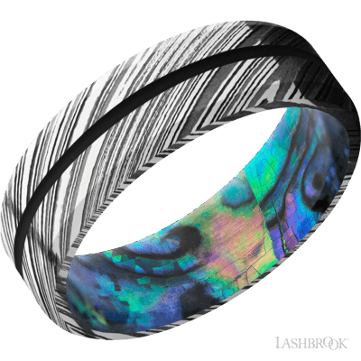 7 mm wide/Beveled/Woodgrain band with one 1 mm Centered inlay of Black also featuring a Abalone sleeve.