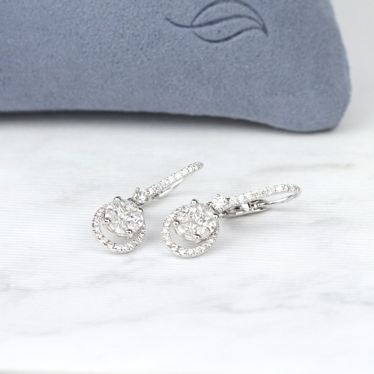 Yellow Gold Oval Diamond Halo Drop Earrings. Timeless diamond drop earrings featuring an oval center of clustered diamonds for maximum impact, framed by a brilliant pavé halo. Secured with a sophisticated leverback.